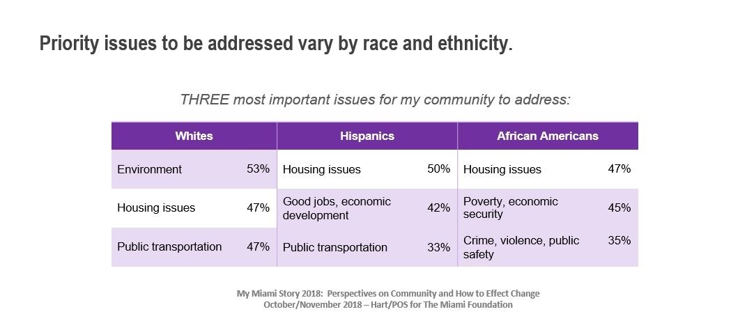 Housing issues, including homelessness and affordable housing, are the top priorities that Miami-Dade residents want to see addressed. This is true regardless of gender, age, education level and neighborhood. There is some variation in priorities between white, African-American, and Hispanic participants. Housing was not the top issue for whites, showing a racial disparity around the issue.