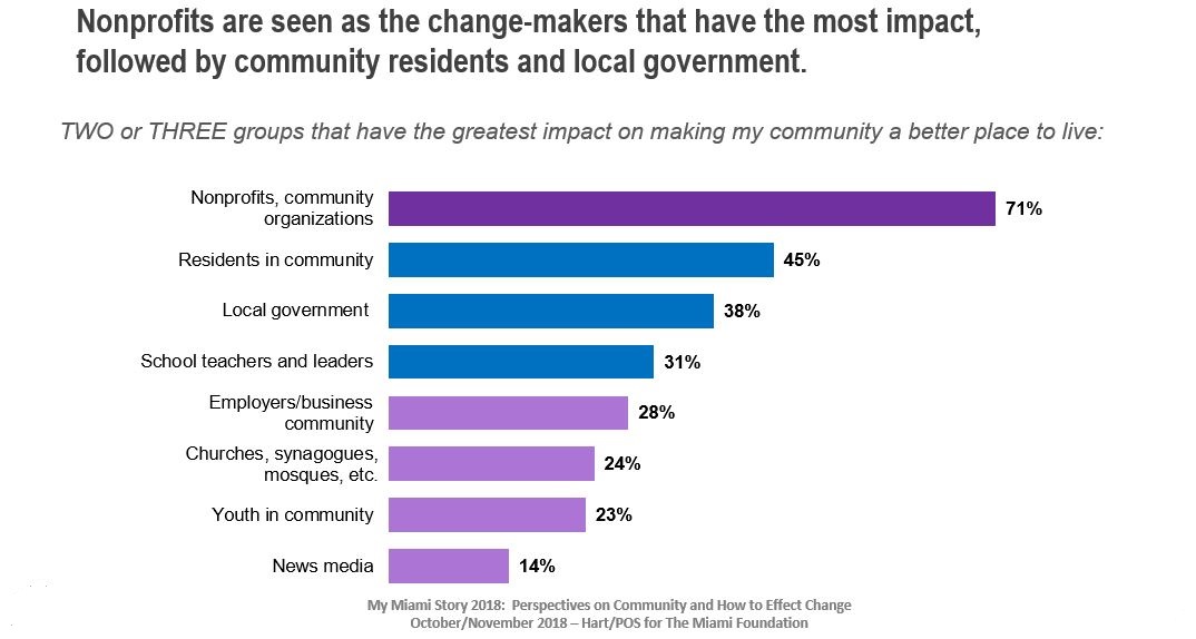 This underscores that these conversations are about more than talking; residents are taking action around the issues discussed. In fact, behind nonprofits and community organizations, the most frequently cited entities that participants view as having the greatest impact on making their community a better place to live are the residents themselves. That is encouraging, as the true power to improve Greater Miami lies within its people.