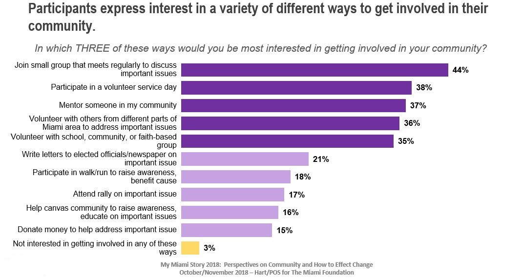 2018 My Miami Story participants who completed the post-conversation survey are highly engaged in their community and express a strong sense of confidence that through their actions, they can make a positive difference. Seven in 10 survey participants are involved in civic and neighborhood activities.