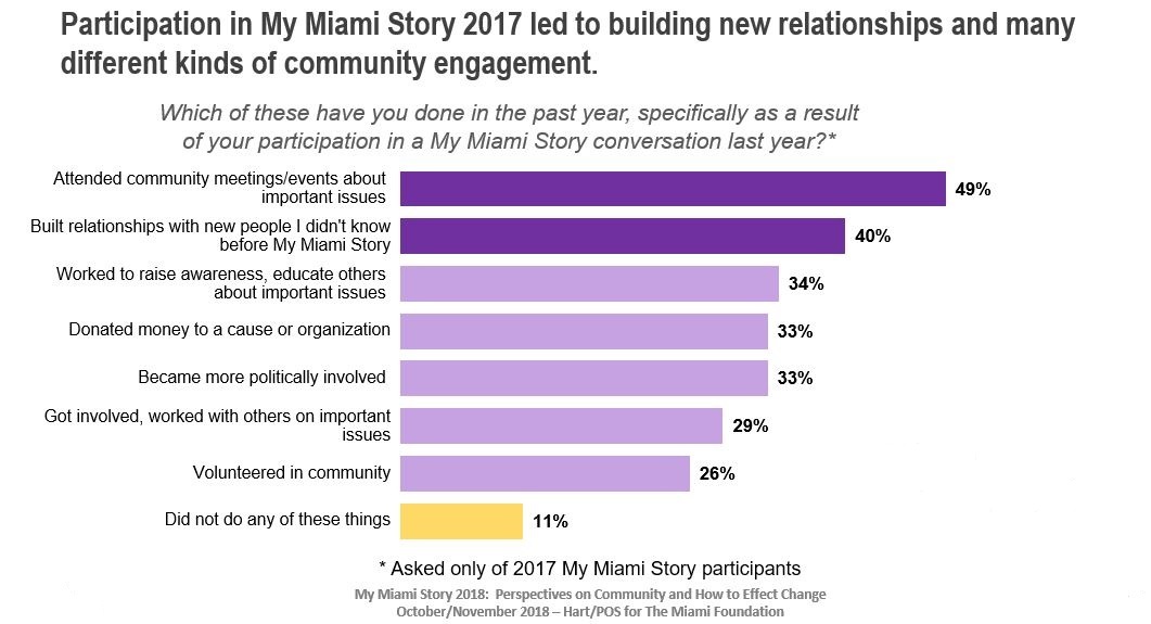 Among 2017 My Miami Story conversations participants who returned to participate again in 2018 (and did the survey), nine in 10 took part in an activity specifically as a result of attending a conversation: