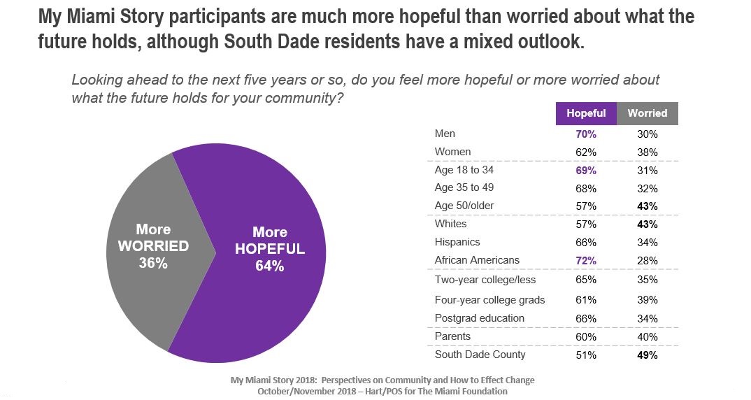 - Men, Millennials, and African-American participants have a hopeful outlook at higher rates, while white participants, those age 50 and older, and those from South Dade express worry at higher rates than most.